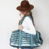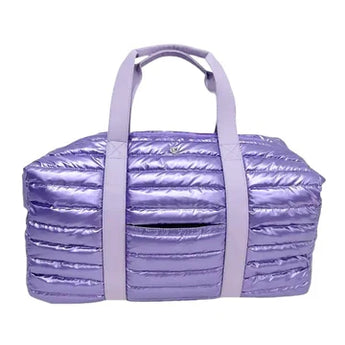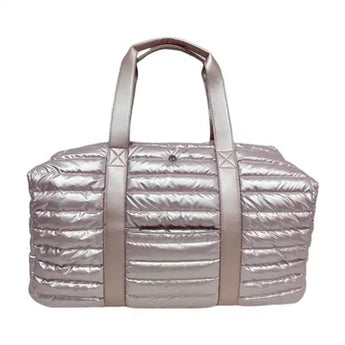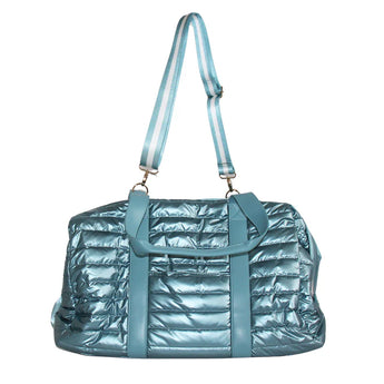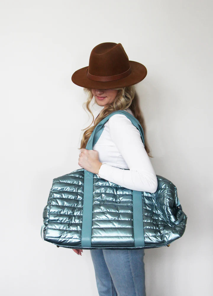 Our Cassie Weekender is perfect for all your overnight adventures. This Nylon Puffer weekender has interior pouch and pockets for your essentials. Featured in a metallic navy with navy striped strap.