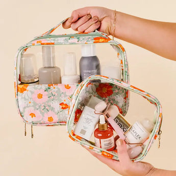 Stay organized and stylish with our Clearly Chic Cosmetic Bag Set! With a sleek clear lining for quick visibility, this set includes two sizes to fit all your beauty must-haves. Whether it’s your makeup, toiletries, or daily essentials, these lightweight and portable bags are designed to keep you stylishly organized. The wipeable surface makes cleanup a breeze, where both bags will keep your items neat and easy to access, wherever life takes you! Clear lining allows for easy visibility Set of two sizes - versatility for all your essentials Lightweight & portable Easy to clean, wipeable surface All around zipper closure on large size DIMS: Large Bag: 10.75”l x 3”w x 8”h Small Bag: 8”l x 2.5”w x 6.5”h