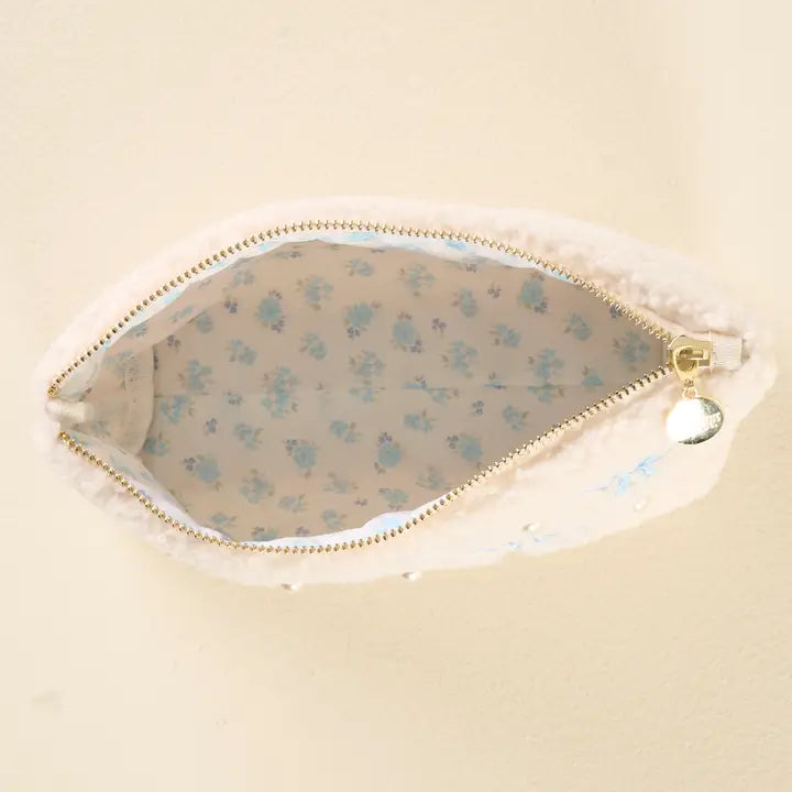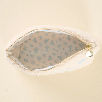 Add a cozy touch to your essentials with our rectangle teddy pouches. Crafted from soft sherpa fabric, these pouches feature a wipeable lining for easy cleaning and gold zippers and hardware for a polished look. The interior is lined with a fun printed fabric, making it as stylish on the inside as it is on the outside.