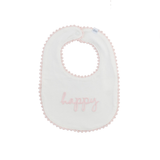 The Happy Embroidered Pink Bib is a delightful addition to your baby's mealtime essentials. Crafted from a soft and stretchy cotton spandex blend, this bib ensures comfort and durability. It features charming chainstitch embroidery that adds a touch of whimsy, while the delicate crochet trim provides an elegant finish. The convenient snap closure makes it easy to put on and take off, ensuring a secure fit. Measuring 9 inches by 6 1/4 inches, this bib offers ample coverage to keep your little one clean and stylish during feeding times. With its high-quality materials, comprising 94% cotton and 6% spandex, this bib is both gentle on the skin and easy to care for, making it a practical and adorable choice for any parent.