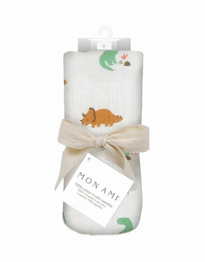 This swaddle blanket is dino-mite. Steal the spotlight at your next baby shower with Mon Ami's Jurassic-themed baby blanket. Generously sized and crafted of premium cotton muslin, this luxuriously soft swaddle blanket will keep baby snug and happy. Our dinosaur-covered baby blanket can also be used as a sun shield over a stroller or car seat, as a privacy throw for nursing or as a plush playmat for tummy time.