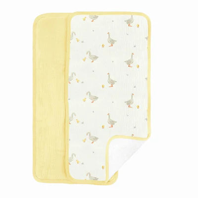 Silly goose, it's time to eat. Mon Ami's Mother Goose 2-Piece Burp Cloth Set is an essential for every newborn. Two unique burp cloths, one in sunny yellow and one adorned with graceful geese, add extra fun to feeding time. Machine washable and dryable, each elegant Mother Goose burp cloth features a cotton muslin front and cotton terry back that cater to a child's sensitive skin.