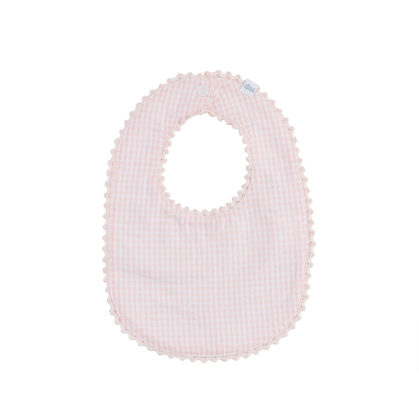 The Pink Gingham Bib is a charming and practical accessory for your little one. This delightful bib showcases a classic gingham pattern, enhanced by intricate chainstitch embroidery that adds a touch of elegance. The delicate crochet trim provides a vintage-inspired finish, making it both stylish and functional. Designed with convenience in mind, the bib features a secure snap closure for easy on and off. Measuring 9 inches by 6 1/4 inches, it offers ample coverage to protect your baby's clothes during mealtime. The front is crafted from 100% cotton, ensuring softness and comfort against your baby's skin, while the back is made from a blend of 94% cotton and 6% spandex, providing a gentle stretch for a snug fit. This bib is not only a practical choice but also a beautiful addition to your baby's wardrobe.