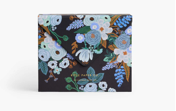 Our essentials card box has a greeting card for every occasion. The box is printed with our Garden Party Blue pattern and gold foil accents, and features a magnetic closure. There are 15 A2 cards in the set for birthdays, thank yous, and more, plus foil-stamped dividers to keep them organized. When you're finished with these cards, refill your box with any of our other A2 cards to always have a greeting on hand.