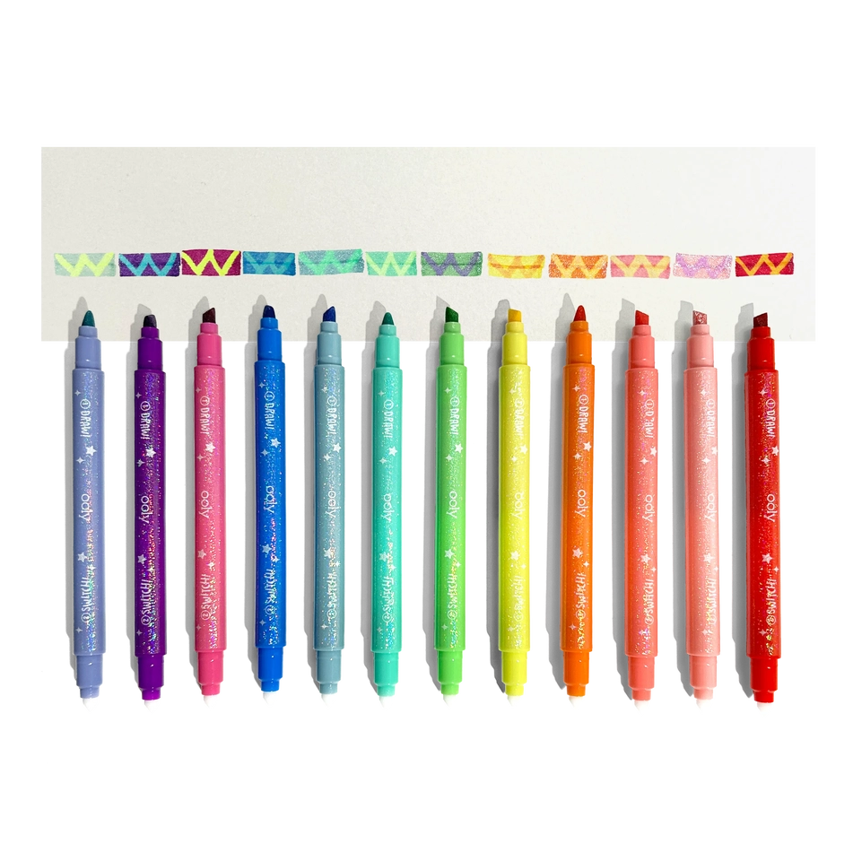 Set of glitter color changing markers 12 glitter marker colors 12 mystery colors when you switch the tip Chiseled tips give thick and thin lines Markers are non-toxic Store markers horizontally to keep the ink flowing Suitable for ages 3 and up
