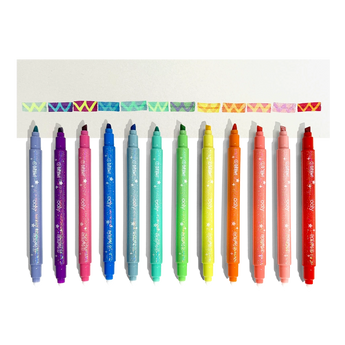 The Switch-Eroo Marker collection has made its own exciting change-up and boy does it shine and sparkle! This set of 12 color changing markers feature a rainbow of shimmery colors on one end and a secret color changing shade on the other. First draw with the glitter tip and then switch it up with the mystery color to create vibrant, glimmering, works of art. Just keep your glitter markers stored horizontally so both ends stay vibrant and ready to use whenever the mood strikes.
