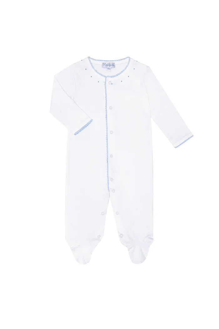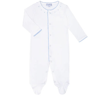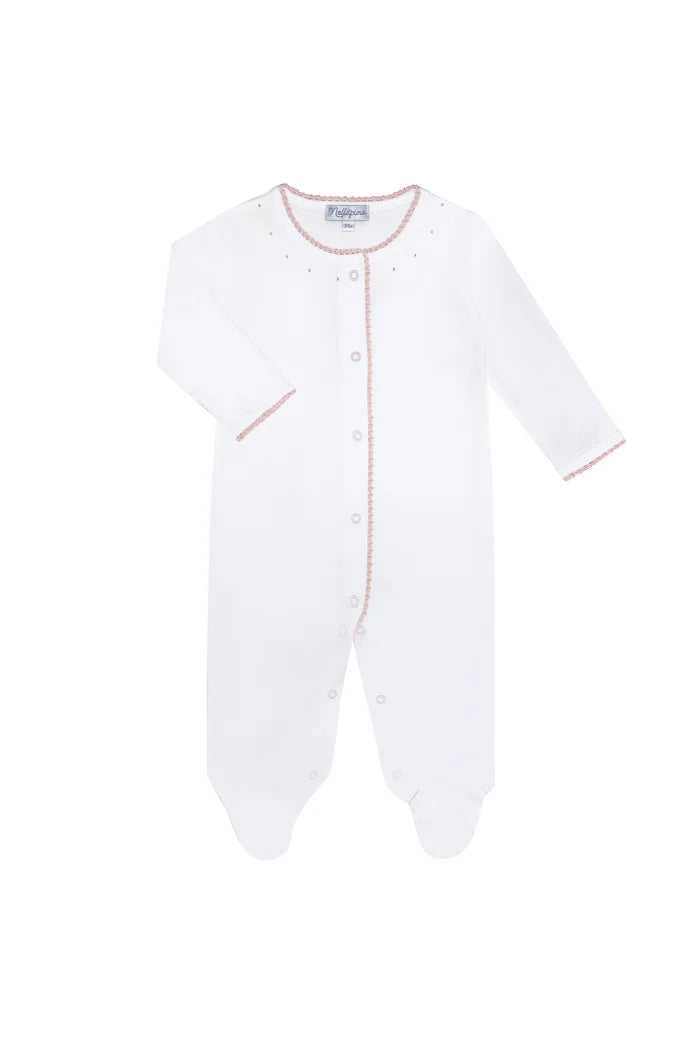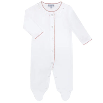Made from 100% pristine white Pima cotton, this footie guarantees unbeatable softness and durability for all-day comfort. The unique handmade crochet trim adds a touch of artisanal charm and elegance, making it perfect for both everyday wear and special occasions. Trust us, they'll love it!