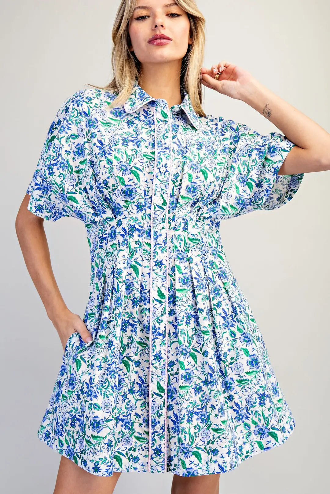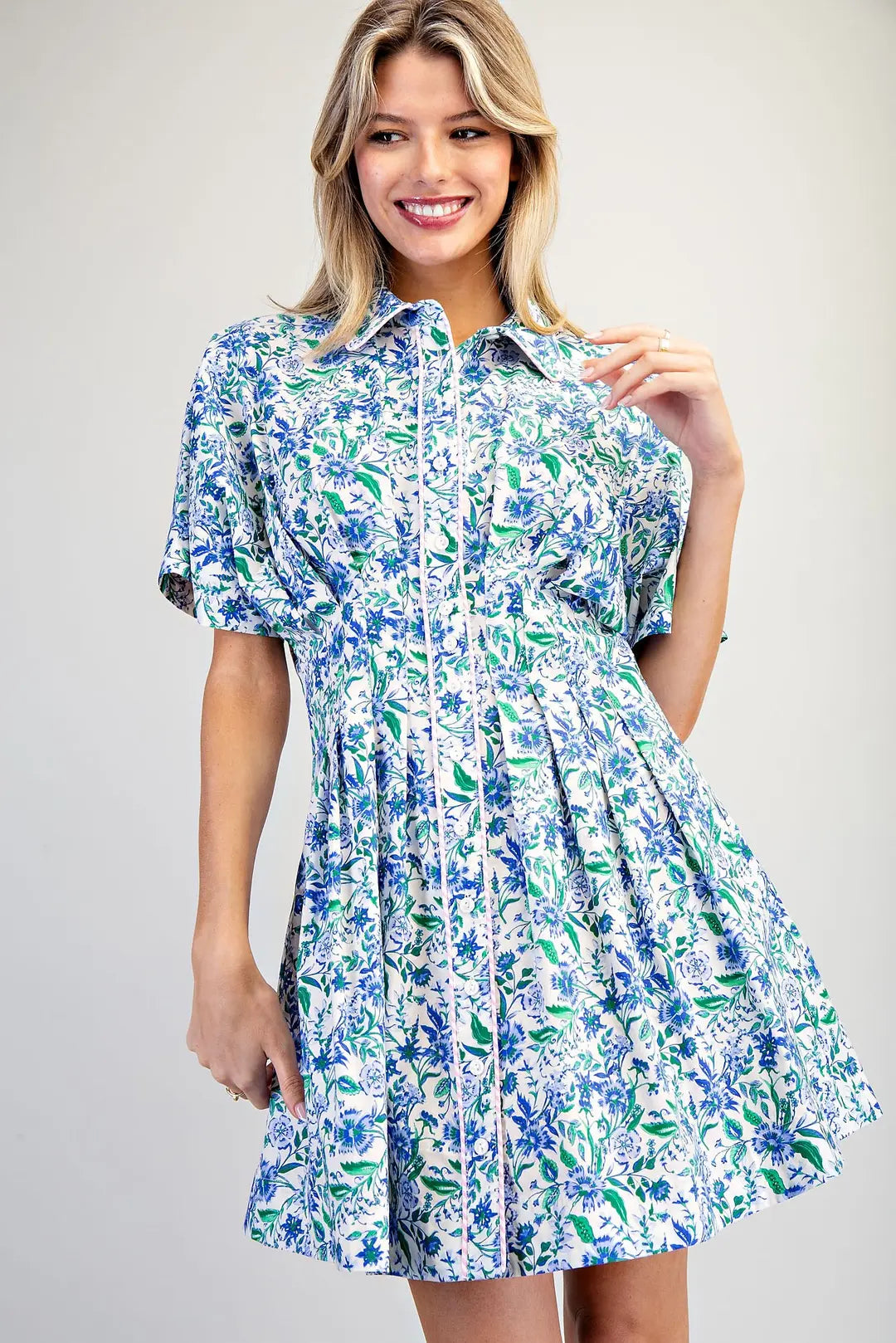 This floral mini dress showcases a collared neckline with a button front placket trimmed in striped piping, short sleeves, a fitted waist with pleated detailing, side seam pockets, and a flared skirt for a polished yet playful silhouette.