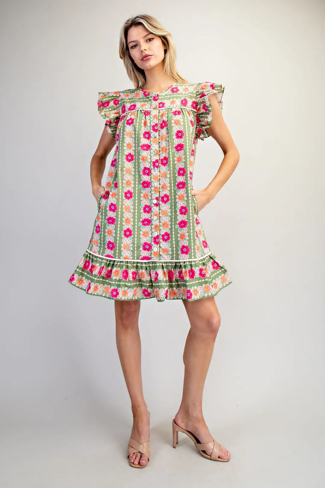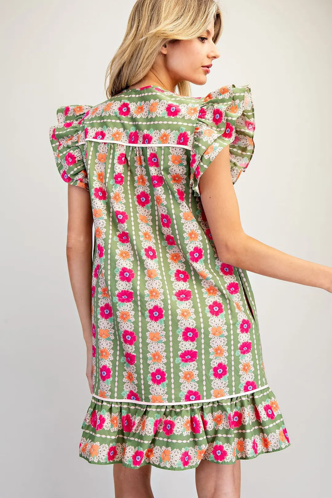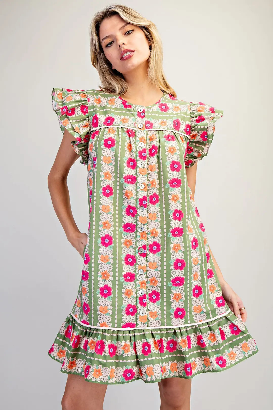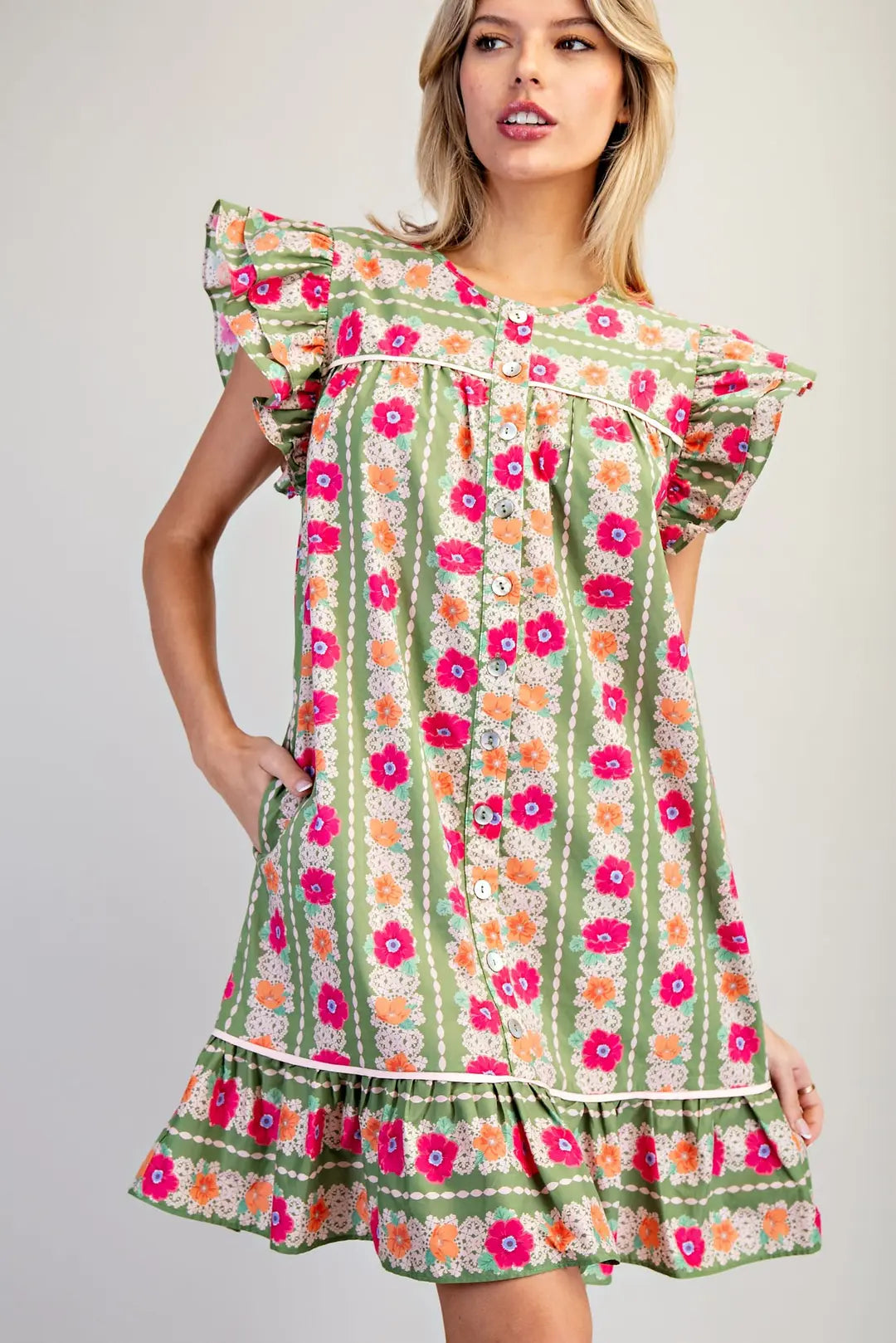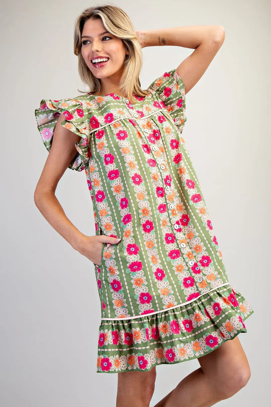 This floral mini dress features a round neckline, layered ruffle sleeves, a button front placket, side pockets, and a tiered ruffle hem with contrast piping, all designed in a bold striped floral print for a bright, playful silhouette.