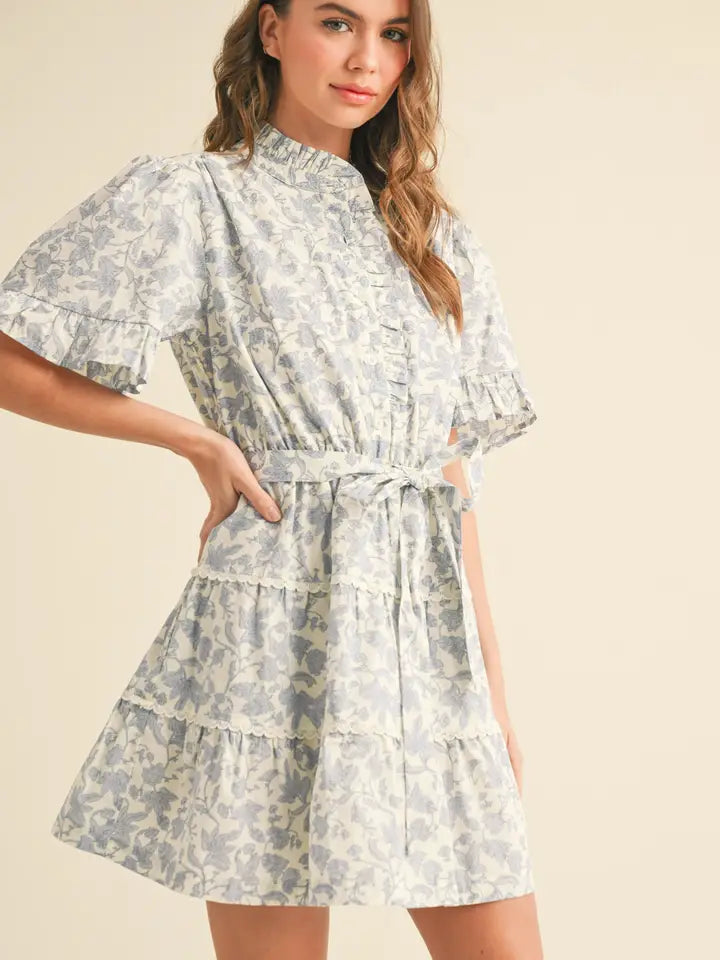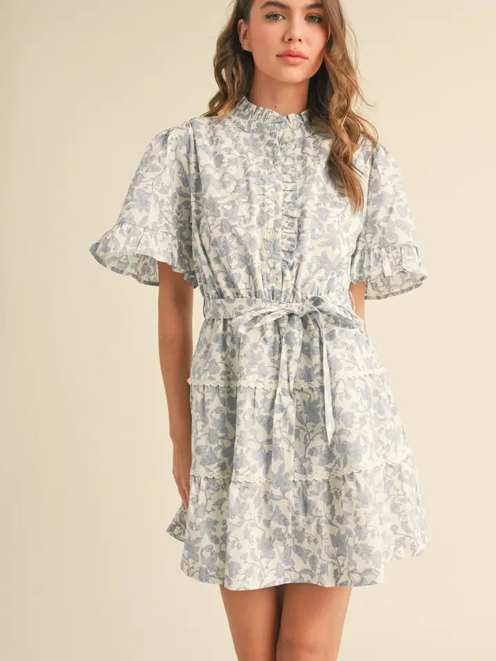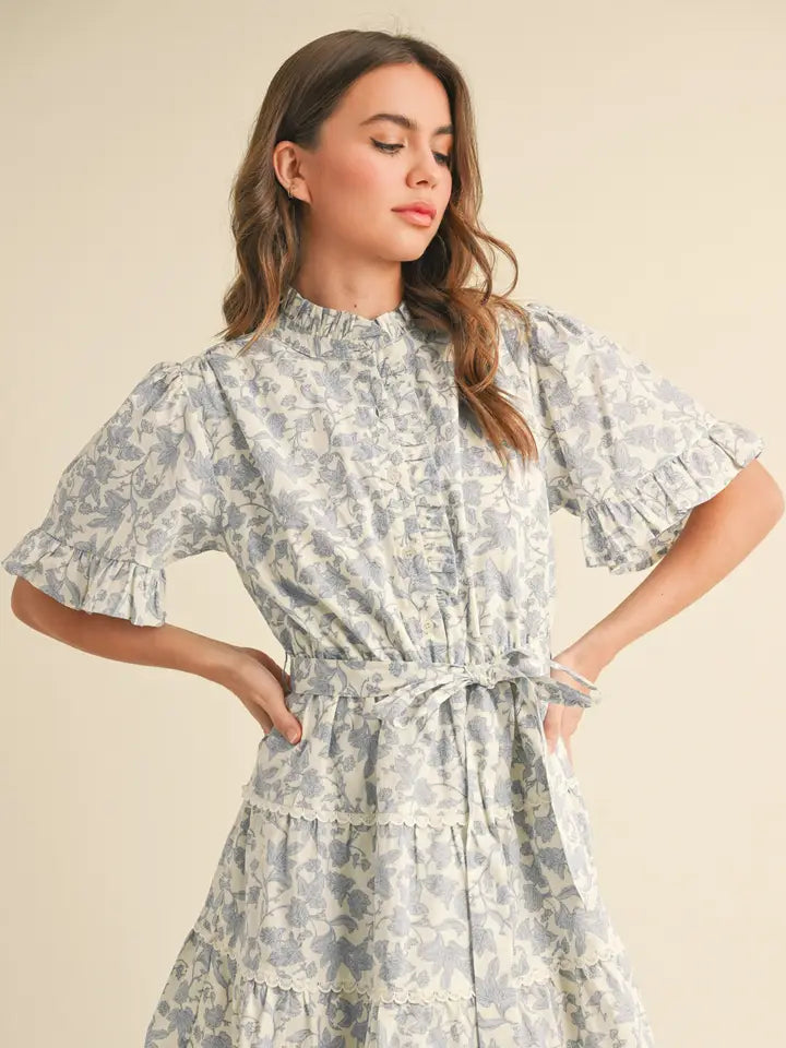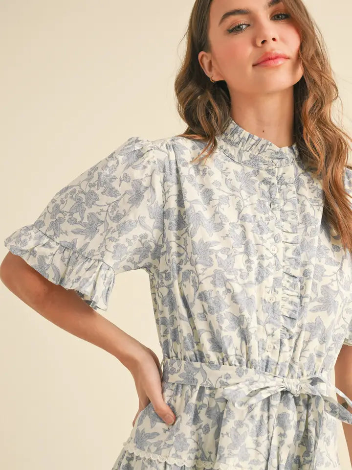 Ruffled button down floral mini dress + Ruffled neckline + Button down placket with ruffle trim + Short sleeves with ruffled cuffs + Elastic waistband + Belt loops with self tying belt + Tiered seams with crochet lace trim + Lined + Model is 5' 10.5" 32-24-36 and wears a S