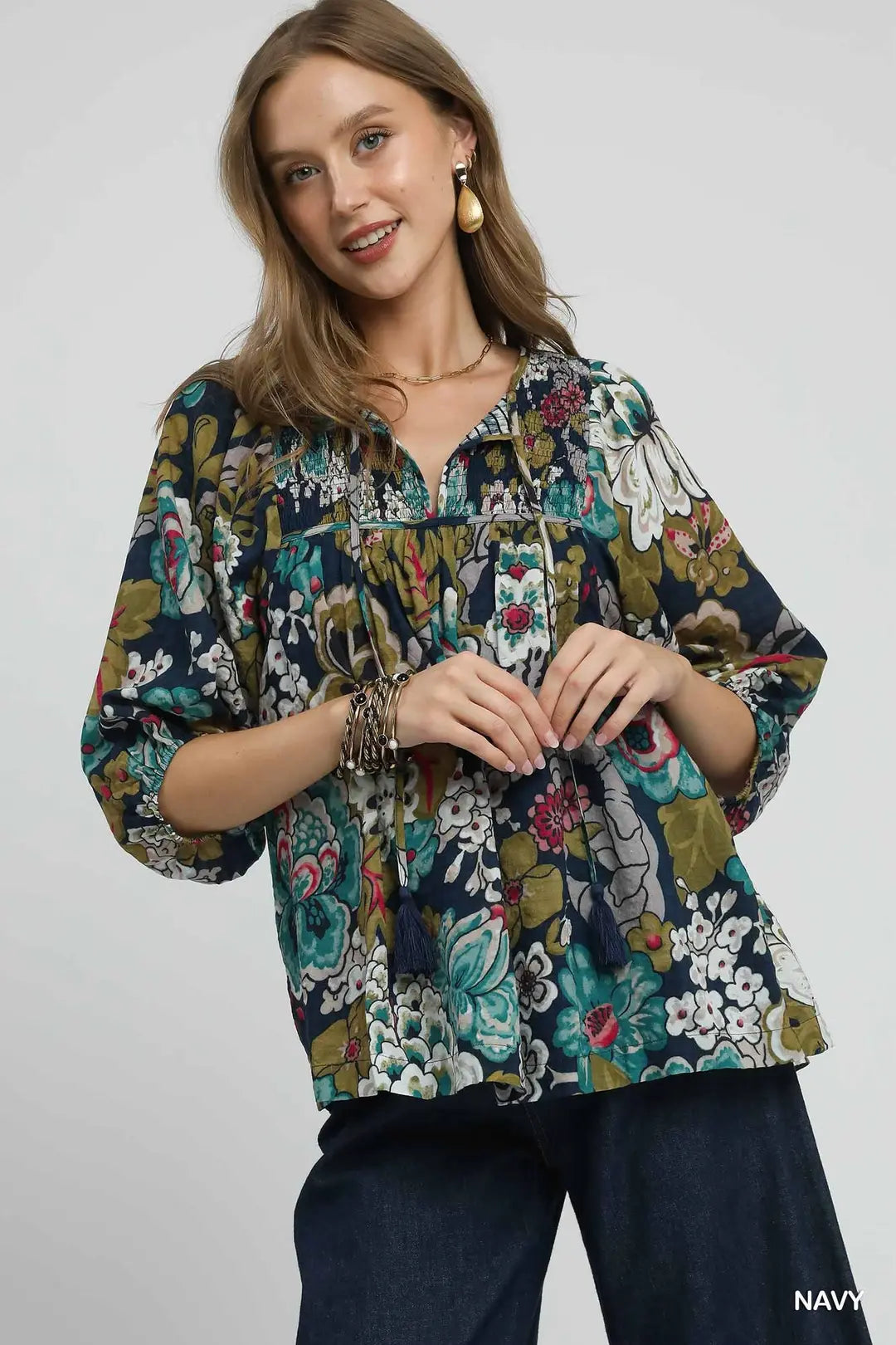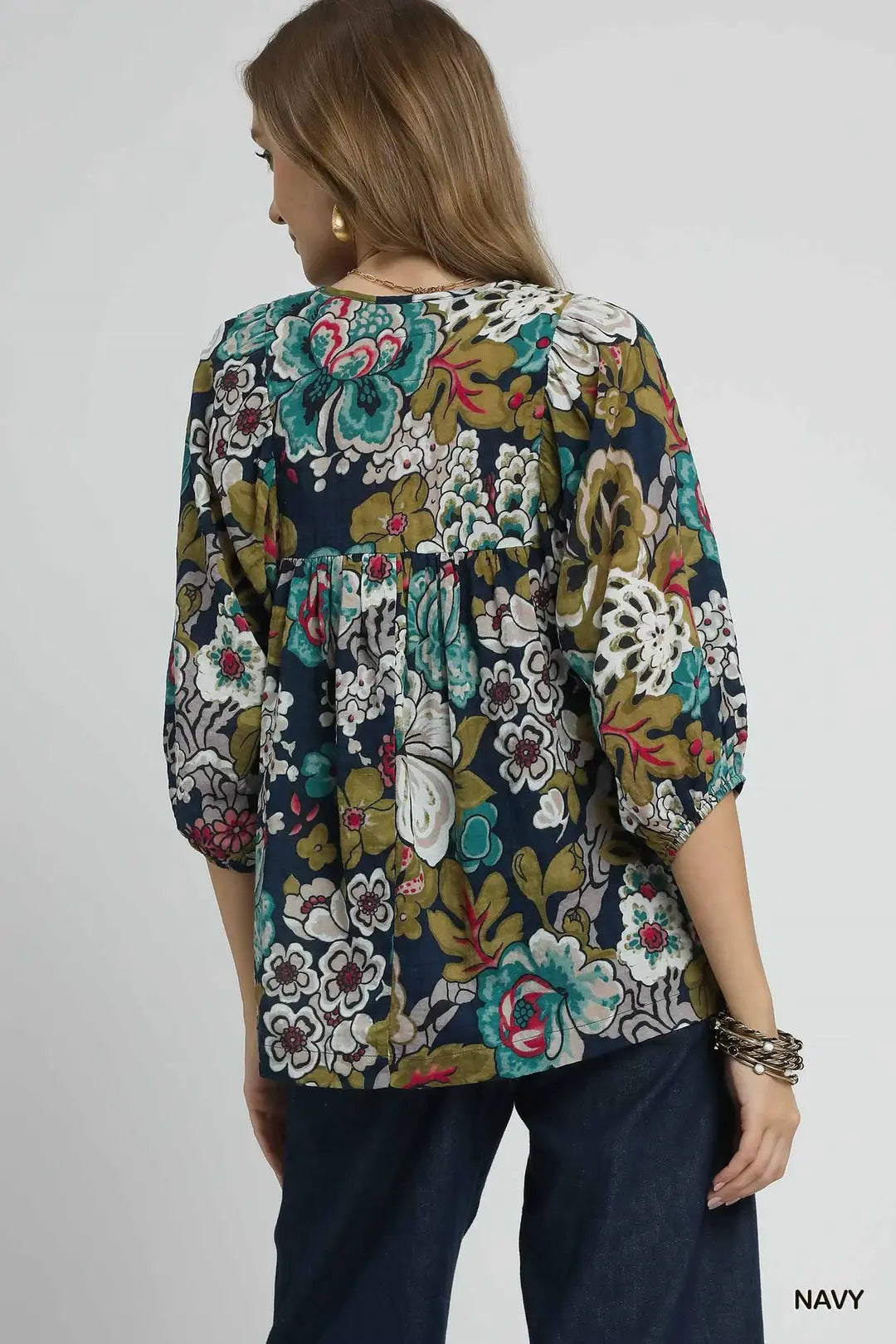 • 3/4 puff sleeves with elastic cuffs