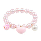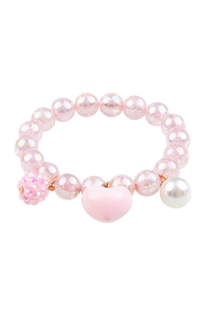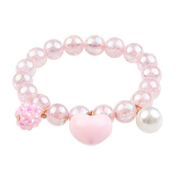 This bracelet has just the right amount of pink and pearl! Round pink beads are accented by three charm pendants: a multifaceted shiny pink bead, a heart pearl pendant and a pearl pendant trimmed in glittery gold details.