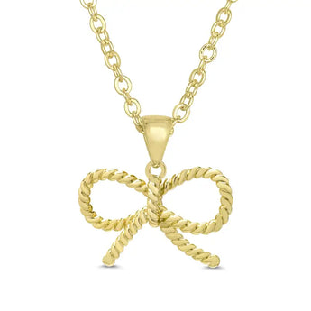This beautiful necklace features a bow pendant adorned with 18k gold plating. Chain is adjustable 14" - 16" and secures with lobster clasp. * Metal Type: Brass * Plating: 18k Gold * Penant Dimensions: 20 x 20 mm * Chain Length: Adjustable 14" - 16" * Clasp: Lobster