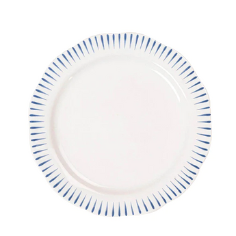 Rimmed with radiant stripes symbolizing the endless paths of awaiting journeys, this versatile dessert/salad plate is up for every culinary adventure, from morning to night. With a fresh whitewash glaze and Delft blue palette, mixing and matching with other collections - and infinite occasions - is a breeze.