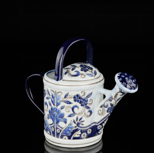 11.5"L X 5.25"W X 8.75"H BLUE AND WHITE PORCELAIN WATERING CAN