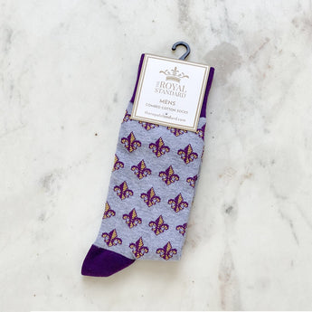 Baton Rouge's favorite color combo, purple and yellow, with a fleur de lis pattern and coordinating purple toe and heel accents.