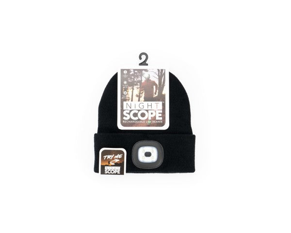 Night Scope is a rechargeable LED beanie hat that makes the ideal companion offering hands-free visibility in the dark. Whether you are camping, hiking, riding, or working, let this be your beacon of light. The LEDs have three levels of brightness to give just what you need, and is easily removed to wash the hat. Rechargeable fixture fits into any standard USB port. Four popular colors with J hook for hanging. Own the night!