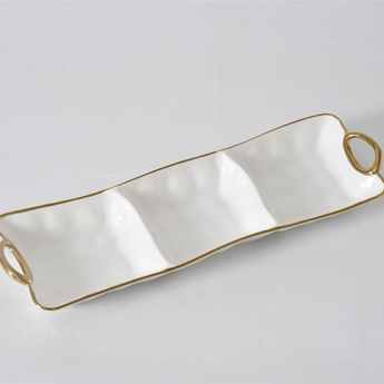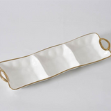 3 Section Server from Golden Handles. Get creative! This piece is great for serving different combinations of snacks, dips and vegetables or all your Tex-Mex needs like guacamole, sour cream and pico de gallo. Gleaming white porcelain with smooth and graceful rim and handles in gold. Food safe. Dishwasher safe. Oven safe to 500°F. Easy Care.