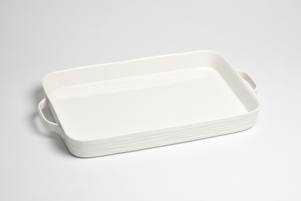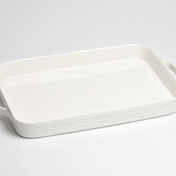 Rectangular Tray with Handles in Le Blanc. Perfect for tempting guests with your delicious main course or hearty sides. Or use for dessert to display an assortment of treats and sweets! Beautifully crafted with clean lines and organic shapes. Food safe, tarnish free, dishwasher safe, oven safe to 500°. Easy Care.