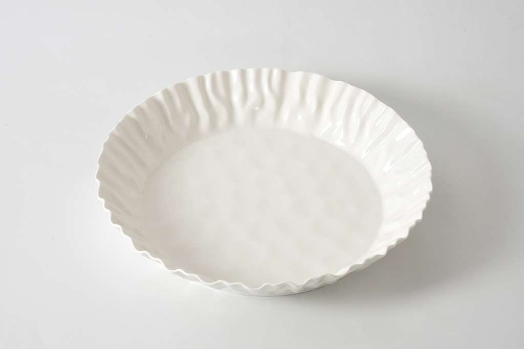 Round Deep Server in Mascali Bianca. A simple and elegant serving piece for crowd pleasing dishes like paella, chicken piccata and fettuccini alfredo. A perfect countertop piece to display fresh fruits or vegetables! Versatile high-fired porcelain pieces that are microwave safe! Food safe, dishwasher safe, oven safe to 500°. Tarnish and stain-free. Easy Care.