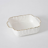 8″ x 8″ Square Baking Dish in Portofino. Impress with your culinary skill and presentation by serving up delicious entrees or pastries in this elegant dish. Beautifully crafted white porcelain with a delicate gold trim. Food safe, tarnish free, dishwasher safe, oven safe to 500°F. Easy Care. Capacity: 1.5 Qt