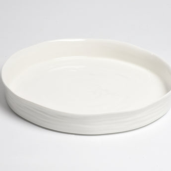 Round Platter in Le Blanc. An incredibly versatile all-purpose serving platter makes an easy transition from oven to table. Stack our snack or small Le Blanc bowls on this platter with sauces or dips to create an all-in-one serving piece! Show off delicious main courses or even desserts on this multi-use platter. Beautifully crafted with clean lines and organic shapes. Food safe, tarnish free, dishwasher safe, oven safe to 500°. Easy Care.