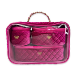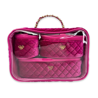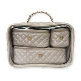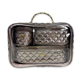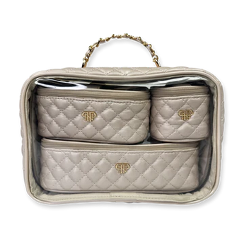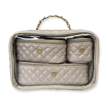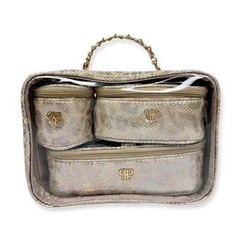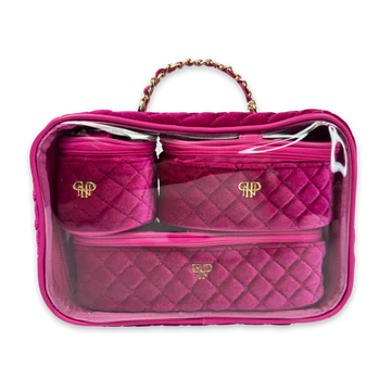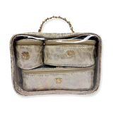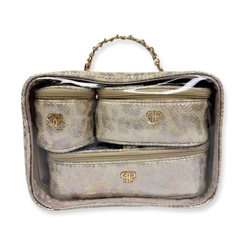 The Trio Jet Setter is your four-in-one answer to beauty on the go - elegant, organized, and effortlessly chic. Inside the clear, structured case with designer inspired chain handle are three removable companion cases (extra small, small, and medium), perfectly sized to keep your makeup, skincare, and everyday essentials in flawless order. Whether you're heading to the office, the gym, or a weekend escape, the Trio Jet Setter keeps everything in place - and your routine looking fabulous every step of the way.