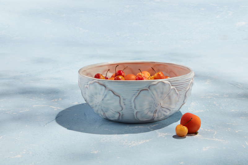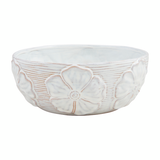 White Flower Stoneware Bowl. This exquisite stoneware bowl showcases a beautifully textured exterior adorned with dimensional sculpted floral designs, adding a touch of elegance to any table setting. Measuring 4 1/4 inches in height and 11 inches in diameter, it offers ample space for serving your favorite dishes. Crafted from high-quality stoneware, this bowl combines durability with a sophisticated aesthetic, making it a perfect addition to both everyday meals and special occasions. Its timeless white finish complements a variety of decor styles, ensuring it will be a cherished piece in your collection for years to come.