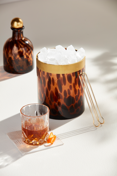 The Tortoise Ice Bucket Set is a sophisticated addition to any home bar or entertaining space. This elegant 2-piece set features a beautifully crafted tortoise glass ice bucket, designed to keep your ice perfectly chilled while adding a touch of luxury to your gatherings. The bucket is adorned with a hand-painted gold rim detail, enhancing its refined appearance and making it a stunning centerpiece for any occasion. Accompanying the ice bucket are sleek metal tongs, ensuring easy and stylish handling of ice cubes. The bucket measures 7 inches in height and 6 1/4 inches in diameter, while the tongs are 6 1/2 inches long, making this set both functional and aesthetically pleasing. Crafted from high-quality glass, this set is perfect for those who appreciate fine craftsmanship and timeless design.