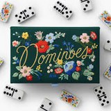 A set of 28 dominoes with illustrated designs, packaged in an embroidered keepsake box that’s designed for display. The box includes a magnetic closure, grosgrain ribbon pull, and a card with instructions for how to play.