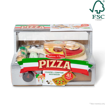 Mama mia, it’s pizza time! Create fresh-baked pizza, made to order, with this deliciously unique 41-piece pizza making set. Start with felt sauce and cheese on the wooden crust, choose from wooden toppings (pepperoni, olives, mushrooms, and peppers), then “bake” in the pizza oven built in to the storage and serving counter. Pieces stick together with self-stick tabs and can be sliced with the rolling wooden cutter. The set comes with a grated cheese shaker, a wooden paddle, pizza box, a reusable menu for placing orders, a guide to help with pizza prep, and play money to pay for your order! This product is certified by the Forest Stewardship Council. FSC certification ensures that products come from responsibly managed forests that provide environmental, social, and economic benefits, and that forests are protected for future generations.