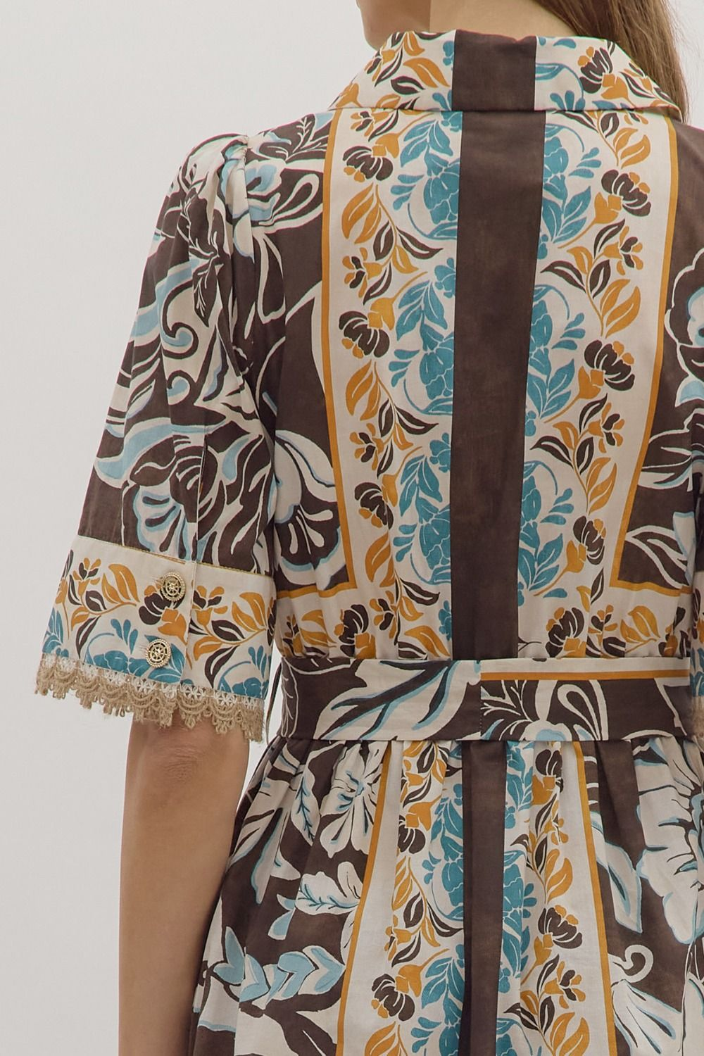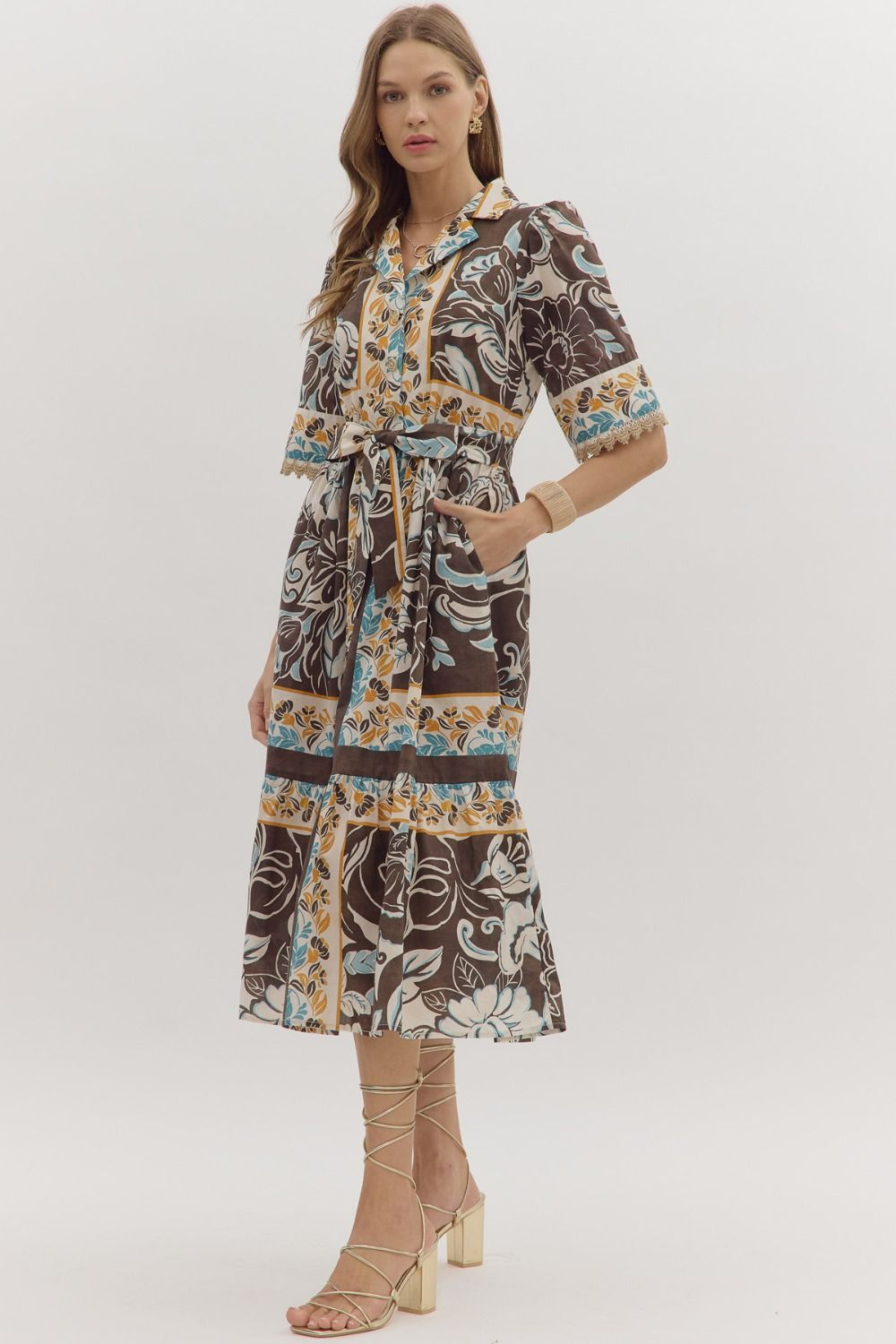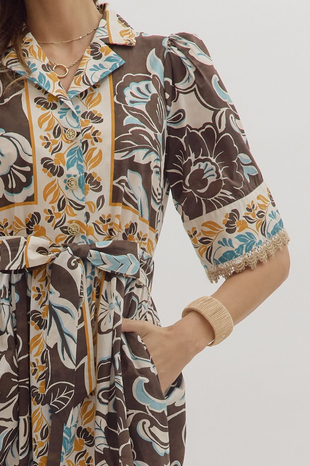 Floral print short sleeve midi dress featuring notched collar and self tie at waist. Lace trim at sleeve opening. Button closure at front. Side pockets. Lined. Woven. Non-sheer. Lightweight.