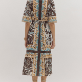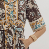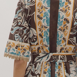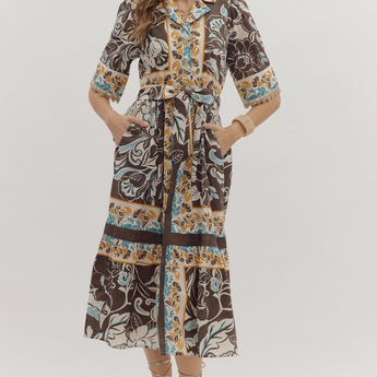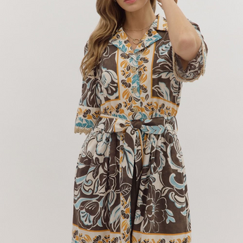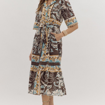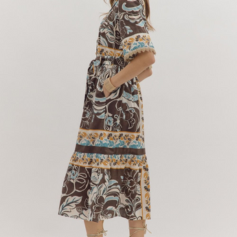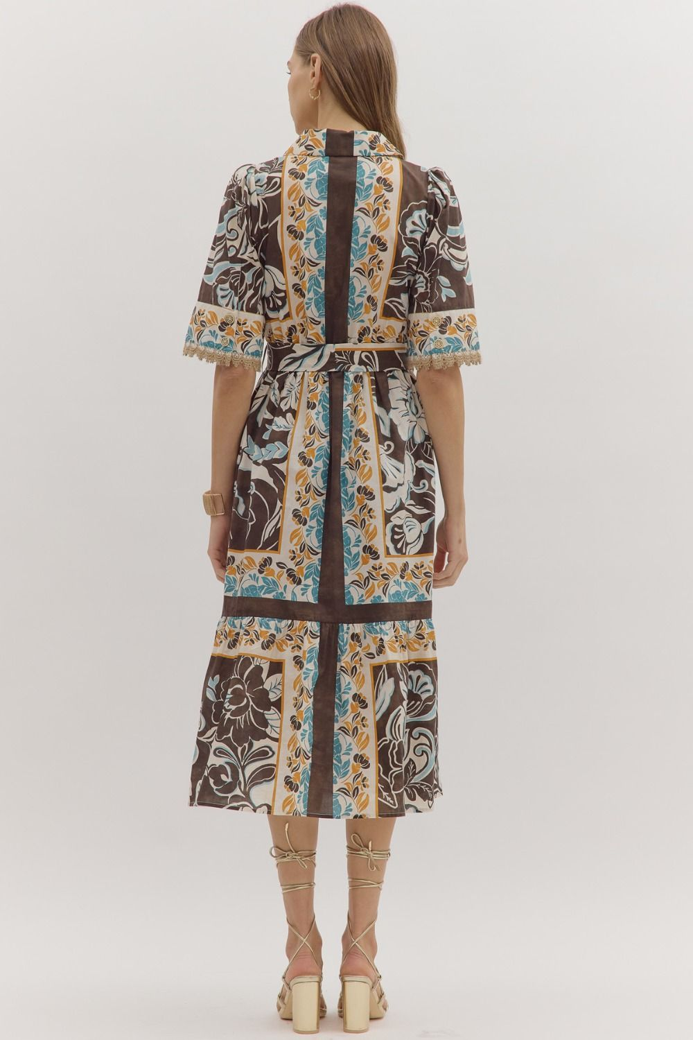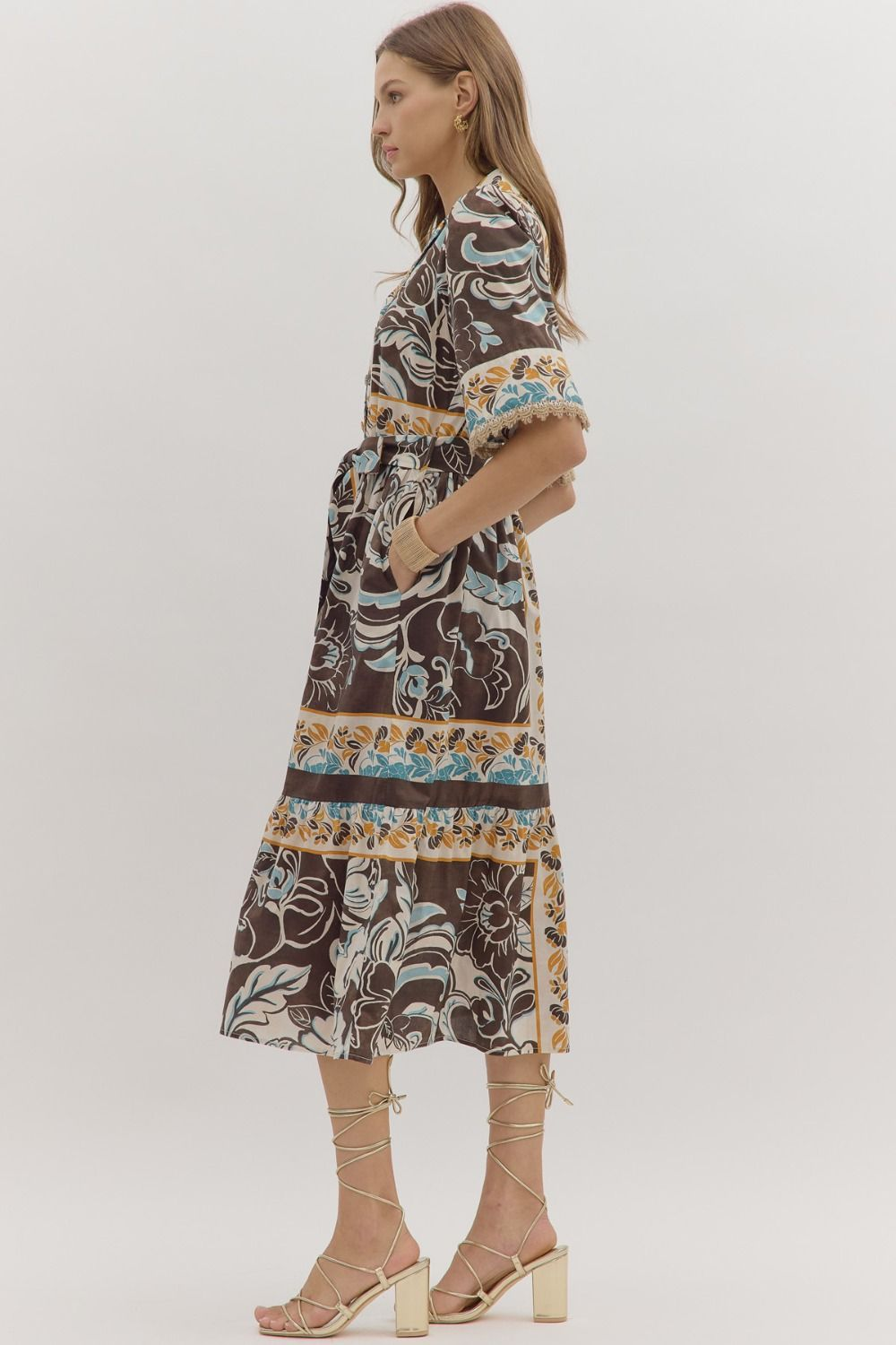 Floral print short sleeve midi dress featuring notched collar and self tie at waist. Lace trim at sleeve opening. Button closure at front. Side pockets. Lined. Woven. Non-sheer. Lightweight.