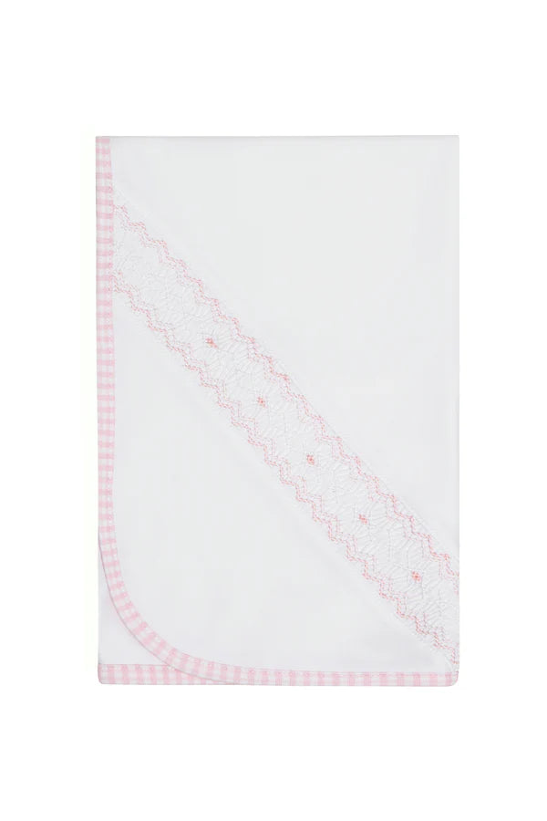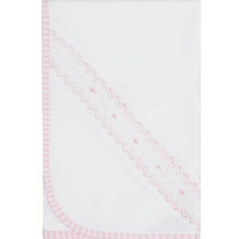 This blanket is crafted from 100% Pima cotton, ensuring it is lightweight, breathable, and protective for your little one. With its charming pink gingham trim, this blanket is a delightful addition to any baby's essentials.